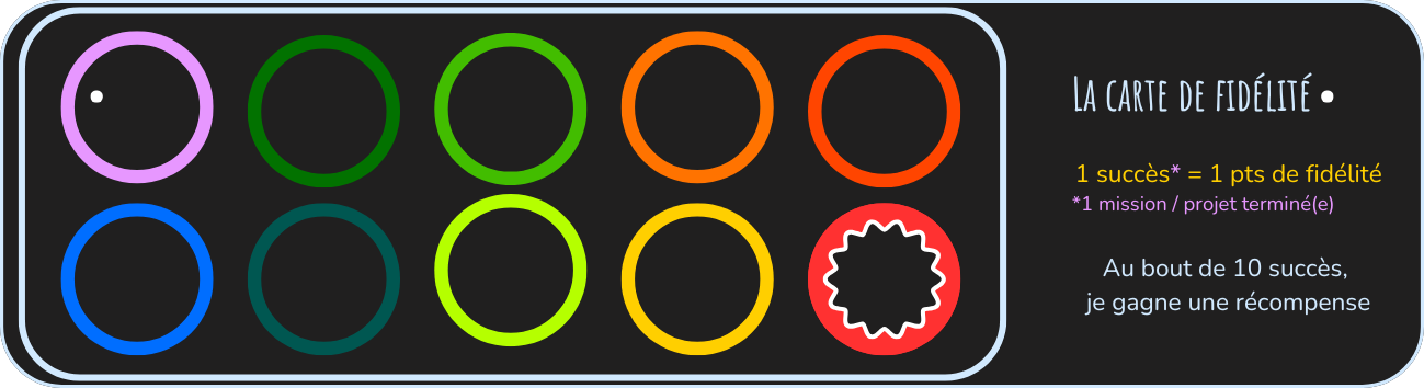 Elle porte bien son nom, comme un système de point, tu coche un point de fidélité à chaque fois que tu a été au bout de ta mission, de tes indispensables de la semaine, etc... A, la fin, tu mérite bien une récompense. Elle te permet de visualiser tes succès en cours et combien il te reste à en accomplir pour avoir une récompense. Et quoi de mieux pour se motiver que d'avoir une carotte au bout du fil ?