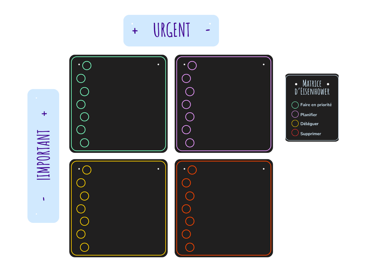 La Maitresse est une widget qui reprend la matrice d'Eisenhower pour vous aider à prioriser vos tâches. Widget phare de notre boutique, parfaitement adapté aux personnes ayant un TDAH ou neuro-atypique mais également à tous ceux qui ont du des difficultés à gérer un projet et se perdent dans la masse de choses à faire. Parfait pour évaluer quoi déléguer, quoi supprimer ou faire en dernier et qu 'est qui est réellement urgent. Pratique pour rendre des projets clairs, en temps et en heure, efficacement et sans se prendre la tête, ou simplement remettre de l'ordre dans ses idées, . Plus efficace qu'une to-dolist.