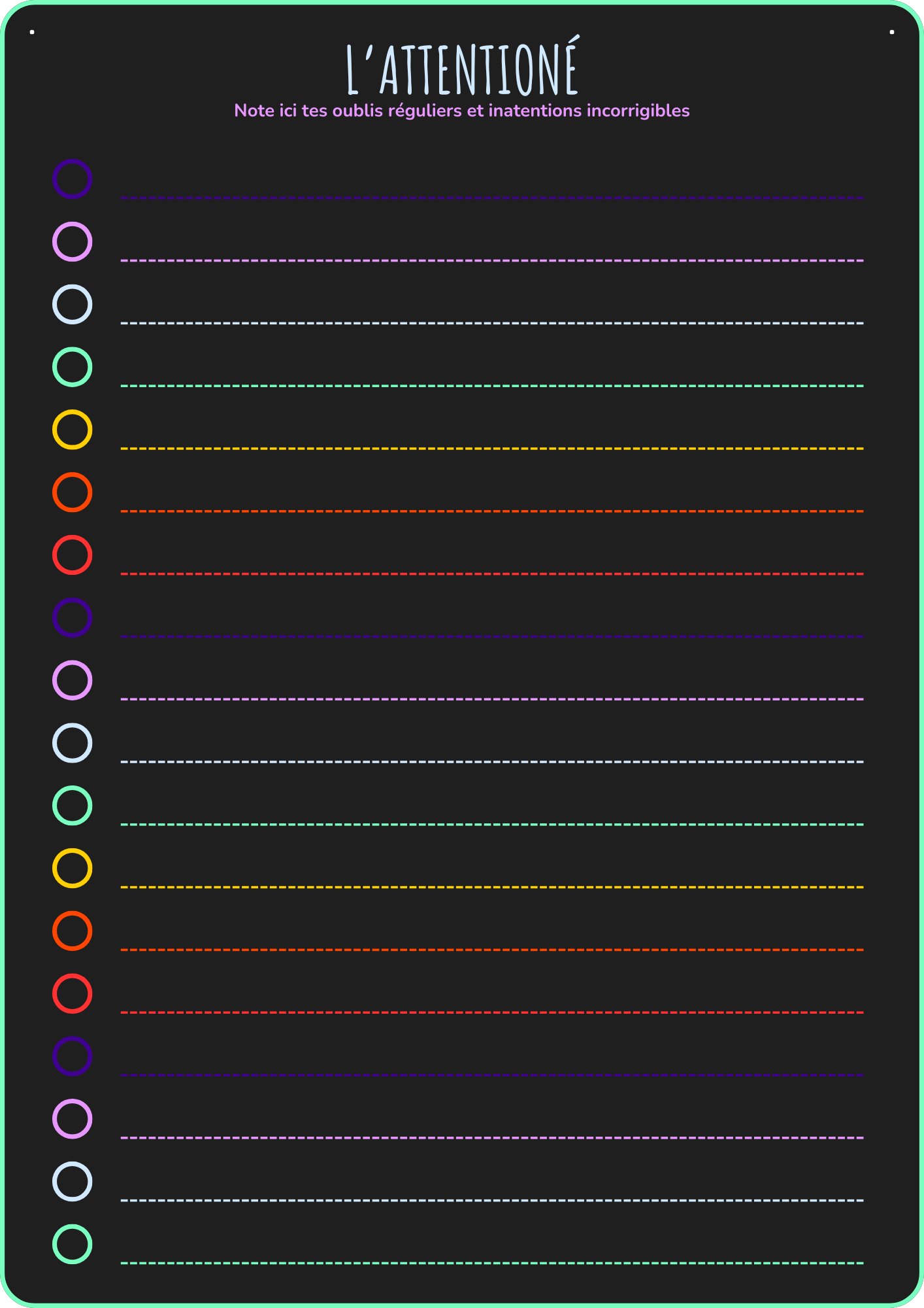 Dites adieu aux inattentions !! Notez toutes vos petites erreurs répétitives, celles que vous n'arrivez pas à corriger même après 10mois, l'attentionné vous permets de suivre l'avancé de vos tâches et de cocher les points qui vous demande plus d'attention en temps normal à chaque fois que vous avez terminé de les vérifier et de les corriger sur votre projet. Il règle les problèmes de distraction : Même si vous repérez une erreur ailleurs ou êtes distrait par autre chose, ce widget vous rappel où vous en étiez et vous permet de reprendre votre vérification là où vous en étiez.