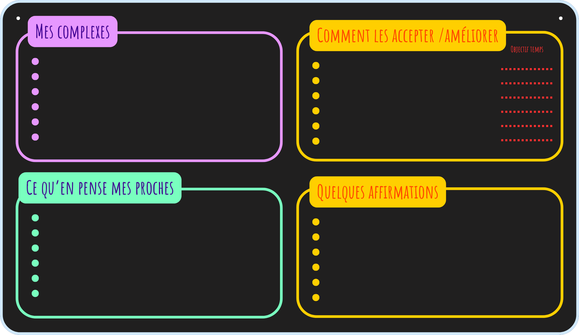 Adopter une nouvelle routine pour s'accepter enfin, c'est aussi prendre conscience de la réalité et tout faire pour améliorer ce qu'on arrive toujours pas à aimer chez sois. Le décomplexiflor explore plusieurs méthodes pour accepter tes complexes. En les travaillant ou en prenant conscience que ta vision n'est pas celle des autres, tu finiras par t'aimer dans ton intégralité. Grâce à des affirmations, la modification d'habitudes : activité physique, exercice de méditation et de réflexion... (que tu peux retrouver dans une des playlists de l'entrepreneur par exemple) et le points de vue de tes proches tu retrouve confiance en toi !!