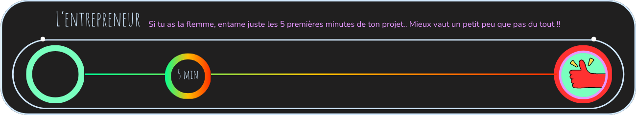 L'entrepreneur comprend 2 steps : Vous cochez le premier lorsque vous avez avancé les 5 premières minutes de votre projet et le second une fois qu'il est terminé. Vous pouvez même ajouté une récompense sur ce step pour vous motiver encore plus à aller au bout de votre mission !